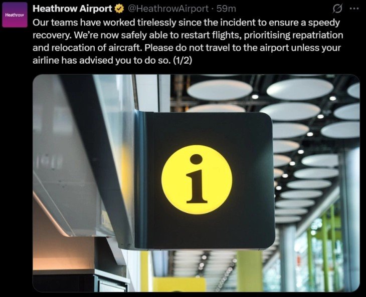 -Нашите тимови неуморно работат по инцидентот за да обезбедат брзо закрепнување. Сега сме во состојба безбедно да ги продолжиме летовите, давајќи им приоритет на репатријацијата и трансферот на авиони, се вели во соопштението на аеродромот објавено на „Х“. „Се надеваме дека целосно ќе ги обновиме операциите утре и наскоро ќе обезбедиме дополнителни информации. Наш приоритет останува безбедноста на нашите патници и персоналот на аеродромот. Се извинуваме за непријатностите предизвикани од овој инцидент“, се додава.