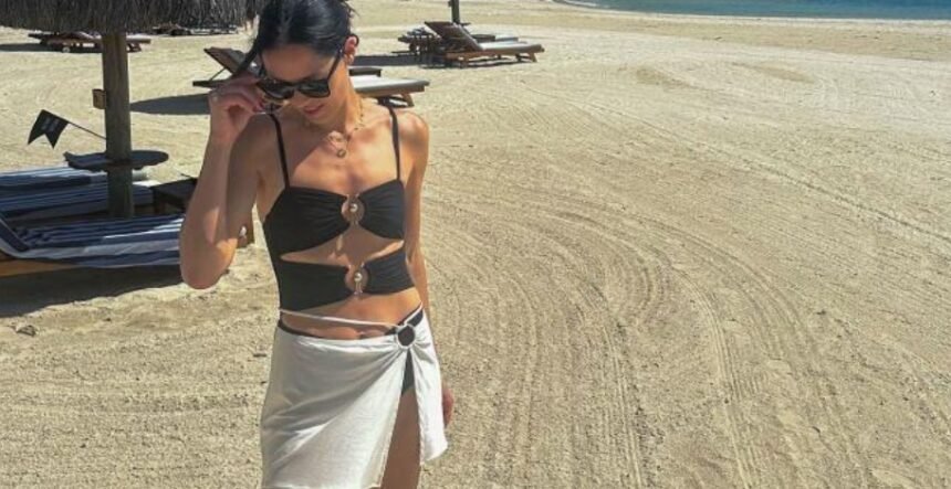 Две прерамки и мини здолниште, односно елегантно црно бикини и кратко бело парео, ја фрлија прекрасната песочна плажа, тропските палми и тиркизната боја на морето целосно во втор план.