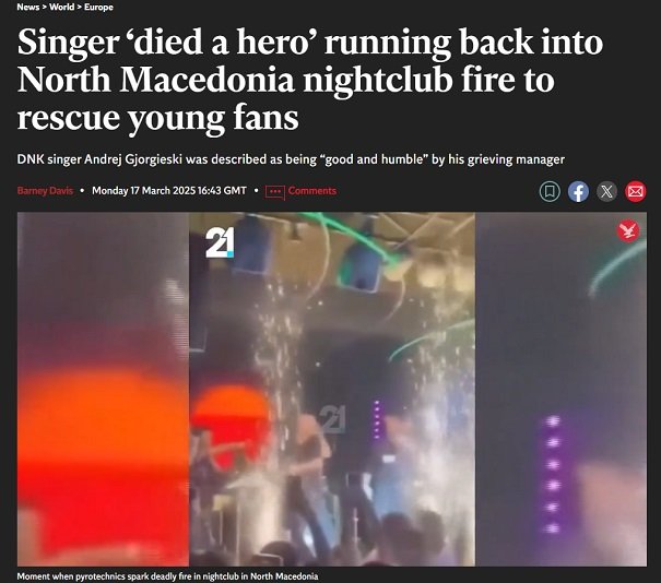 Угледниот британски весник „Индипендент“ посвети поголем текст за трагедијата во Кочани, во која фокусот го става на смртта на Андреј Ѓорѓиески, еден членовите на бендот ДНК, кој трагичната вечер во дискотеката „Пулс“ имаа настап. Под наслов: „Пејачот ‘умре како херој’, втрчувајќи во пожар во ноќен клуб во Македонија за да ги спаси младите обожаватели“, британскиот медиум со долга традиција пишува дека пејачот на ДНК бил опишан како „добар и скромен“ од неговиот ожалостен менаџер.