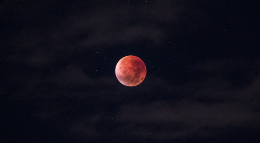 Овој небесен феномен се случува кога Земјата поминува директно помеѓу Сонцето и Месечината, фрлајќи ја својата сенка врз Месечината. Иако е во сенката на Земјата, Месечината не исчезнува целосно, туку добива црвеникава нијанса. Оваа боја е резултат на расејувањето на сончевата светлина од атмосферата на Земјата, слично на тоа како кога зајдисонцата изгледаат црвени.