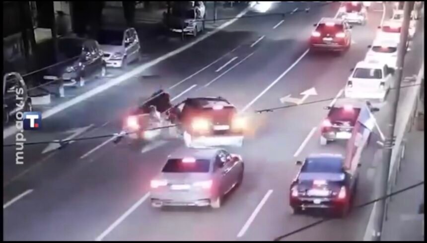 На социјалните мрежи се појави видео од сообраќајна несреќа во Белград во која возач на автомобил удрил полицаец на мотор.