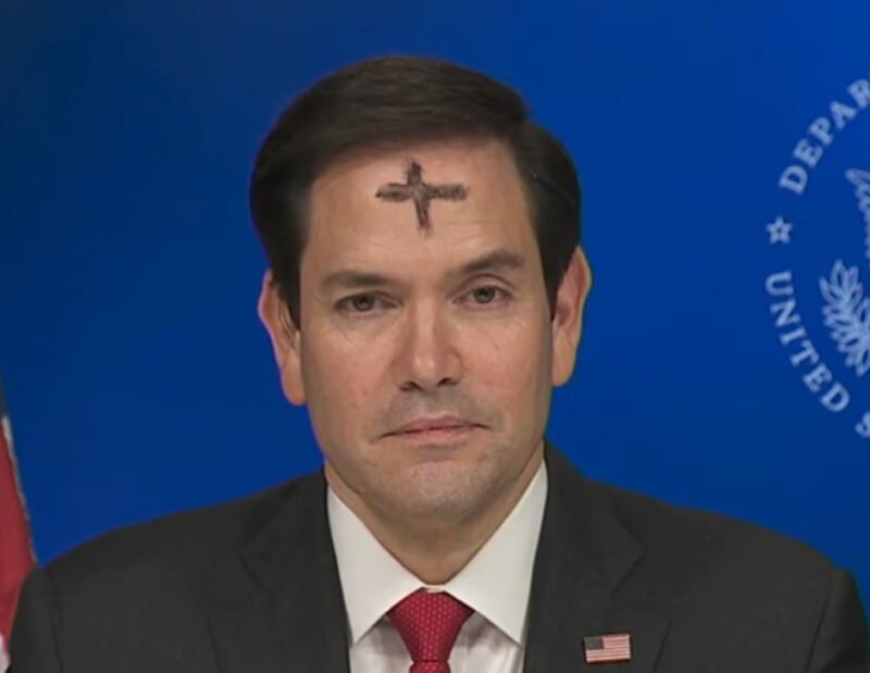 Is the US Secretary of State Marco Rubio spewing Russian propaganda with a giant cross painted in the forehead? pic.twitter.com/1bwtj0hib6