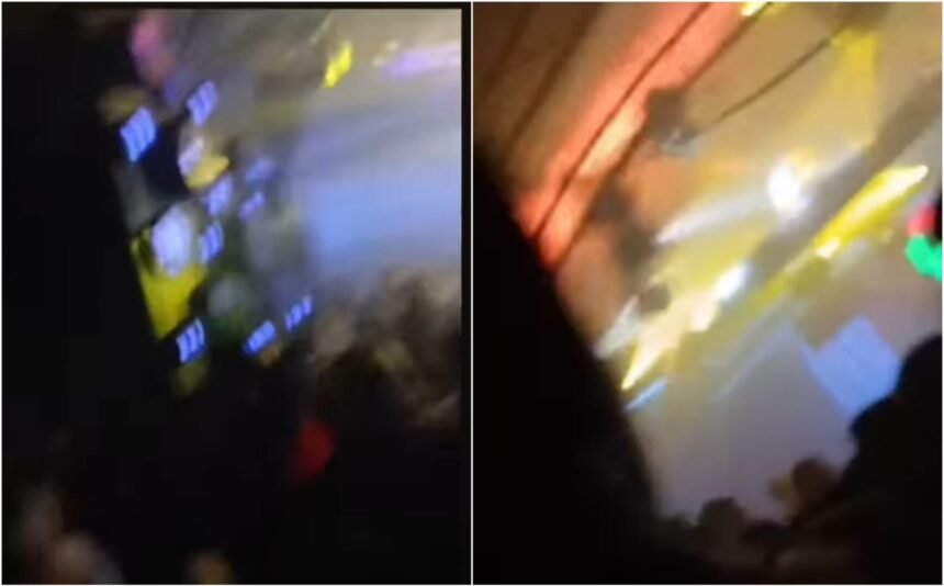 На видеото може да се забележат првите моменти кога започна пожарот, луѓето во паника пробуваат да излезат од објектот.