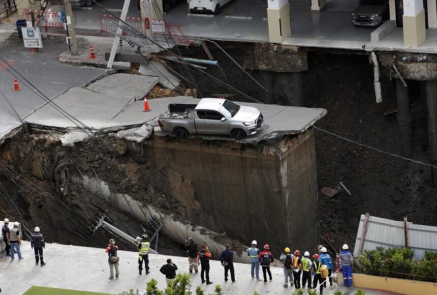 Soil rushing into an underground subway tunnel, possibly triggered by a burst water pipe, is being investigated as the cause of a massive road collapse on Samsen Road in Bangkok’s Dusit district, which forced the evacuation of Vajira Hospital for safety.