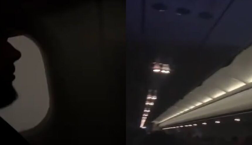 Снимките од кабината го покажуваат авионот како силно се тресе, со светла претежно изгаснати, а црвено светло трепка надвор од прозорецот.