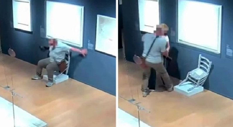 Турист беше снимен на надзорна камера како седи на изложбен стол обложен со кристали наречен „Ван Гог“ во италијанска уметничка галерија, пред столот да се сруши под него.