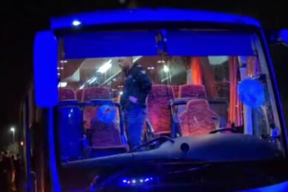 Инцидентот се случи во судиското надополнување на времето, а еден факел директно го погоди фудбалерот на домашниот тим Стронгест.