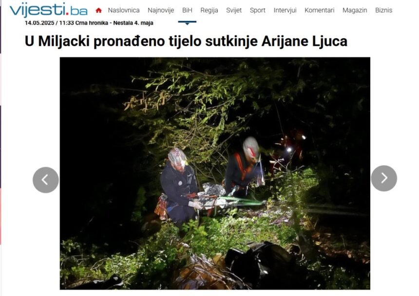 Како што објавија локалните медиуми во средата, телото на судијката Аријана Љуца е пронајдено во вторник доцна вечерта во непристапен дел од кањонот на Миљацка, спротиводно од Сараево, на магистралиот пат Пале – Сараево