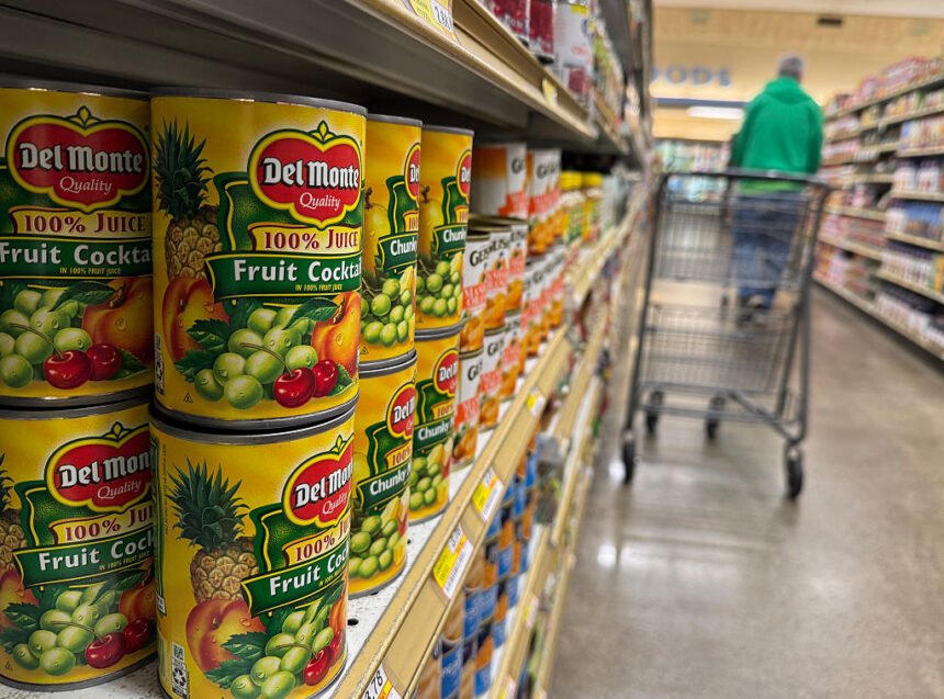 SAN ANSELMO, CALIFORNIA - JULY 03: Cans of Del Monte fruit cocktail are displayed on a store shelf on July 03, 2025 in SanAnselmo, California. California-based food production and distribution company Del Monte has filed for Chapter 11 bankruptcy as the company is facing secured debt of more than $1.2 billion. (Photo by Justin Sullivan/Getty Images)