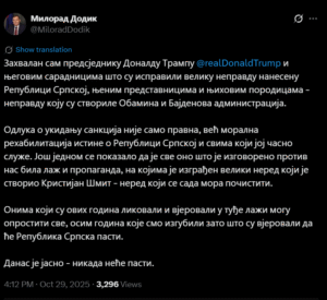 „Благодарен сум на претседателот Доналд Трамп и неговите соработници за корекција на големата неправда нанесена врз Република Српска, нејзините претставници и нивните семејства – неправда создадена од администрациите на Обама и Бајден“, напиша тој.