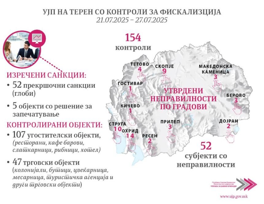 Во периодот од 21 до 27 јули 2025 година, Управата за јавни приходи (УЈП) спроведе вкупно 154 теренски контроли за фискализација, насочени кон различни типови деловни субјекти, меѓу кои: ресторани, кафе барови, слаткарници, колонијали, продавници за облека и накит, месарници, цвеќарници, рибници туристички агенции, хотел и други трговски објекти за продажба на мало.