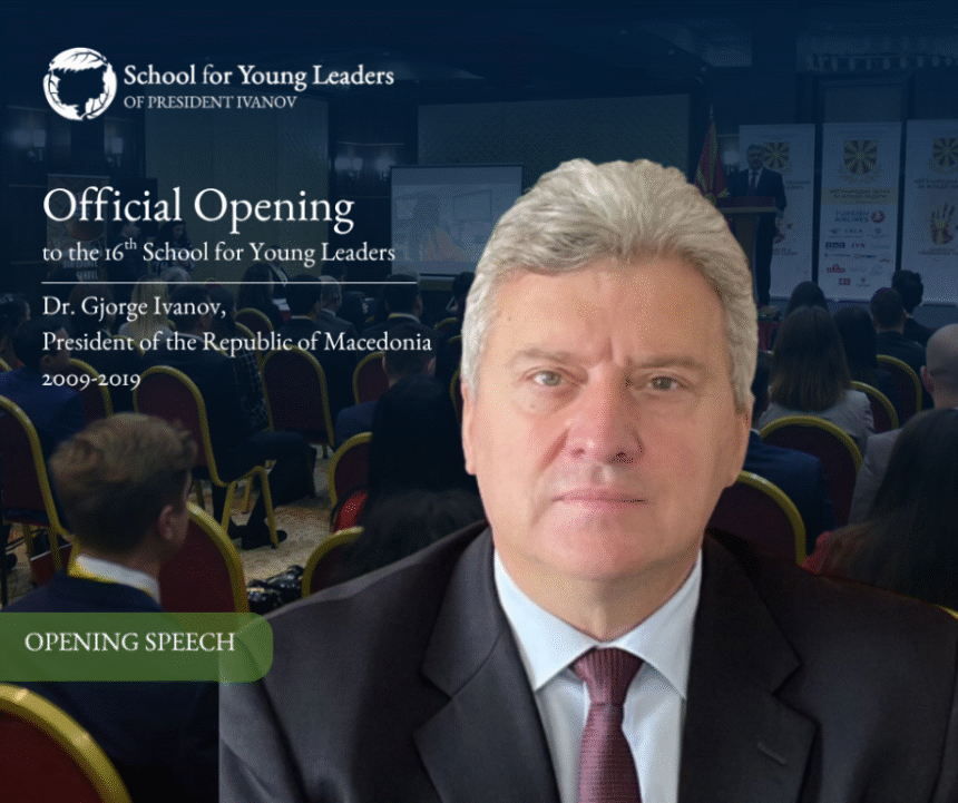 Претседателот Иванов, поздравувајќи ја новата генерација учесници на Школата за млади лидери, се осврна на главната тема на 16-тата Школа и на Целите за одржлив развој на Обединетите нации и Агендата 2030, единствената глобална рамка што нуди излез од кризите и предизвиците со кои се соочува човештвото, зад која застанаа сите земји членки на ОН. Во своето обраќање тој посочи дека постојат бројни причини поради кои овие цели сеуште не се целосно остварени, но дека младите располагаат со највредните ресурси како надежта, енергијата, креативноста и можностите, за да придонесат кон нивно решавање. Во таа насока, тој истакна дека вештачката интелигенција мора да се користи како алатка за креативни решенија на предизвиците во сите области, потенцирајќи дека во ова време се бара нова дефиниција на лидерството – лидер кој ќе може да одговори на комплексноста на современиот свет. Иванов нагласи дека лидерот на иднината треба да биде способен да одговори на она на што не може да одговори вештачката интелигенција и тоа со својата емоционална интелигенција, интуиција, етичност, креативност и човечност, карактеристики кои го прават човекот незаменлив. Посочи дека лидерите на иднината не треба да се натпреваруваат со вештачката интелигенција, туку да создаваат синергија со неа. Наместо стравот, младите треба да посегнат кон надежта и да развиваат одговорен пристап кон новите технологии, користејќи ги нивните придобивки и поставувајќи етички механизми кои ќе спречат нивна злоупотреба.