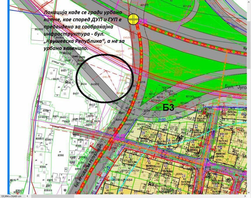 Локацијата која според Генералниот урбанистички план (ГУП) е локација предвидена за изградба на булевар „Крушевска Република“, а според Деталниот урбанистички план (ДУП), оваа зона е предвидена за сообраќајна инфраструктура, а не за урбана опрема и игралишта. Активностите се изведуваат без транспарентност, што го крши законот и урбанистичките норми.