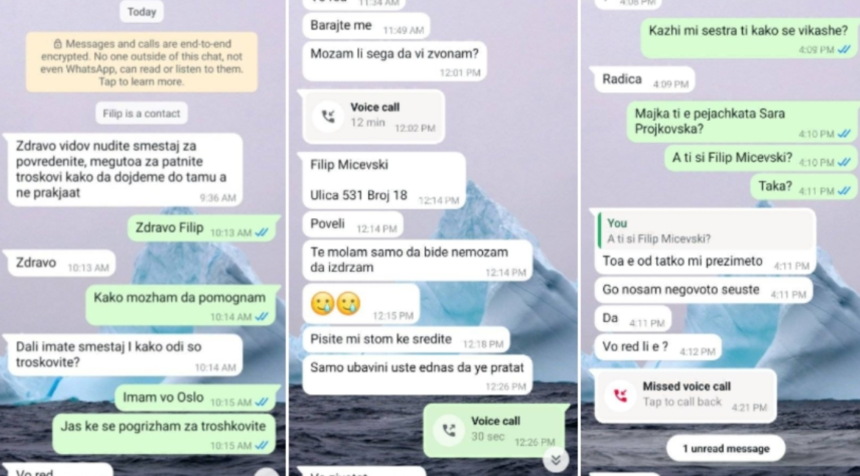 „ВНИМАВАЈТЕ луѓе, постојат нелуѓе! За малку ќе наседнев на измама за пари откако понудив помош по трагедијата во Кочани. Добив повик од дечко кој се претстави како Филип Мицевски, 20-годишен син на пејачката Сара Пројковска, која загина во пожарот. Тој ми раскажа дека неговата сестра, која била со Сара во клубот, сега лежи во болница во Скопје со тешки изгореници и дека во петок треба да ја префрлат во болница во Осло. Звучеше вознемирено, дури и плачеше – толку убедливо што почнав да го тешам. Потоа ми побара пари за маст за изгореници, и тогаш почнав да се сомневам. Ми испрати и слика од пасош, но веднаш забележав по годината на раѓање дека личноста на него е 30-годишен маж, а не 20-годишно момче.