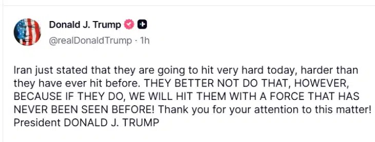 „Иран штотуку изјави дека денеска ќе удри многу силно, посилно отколку што некогаш удриле претходно“, напиша Трамп на Truth Social.