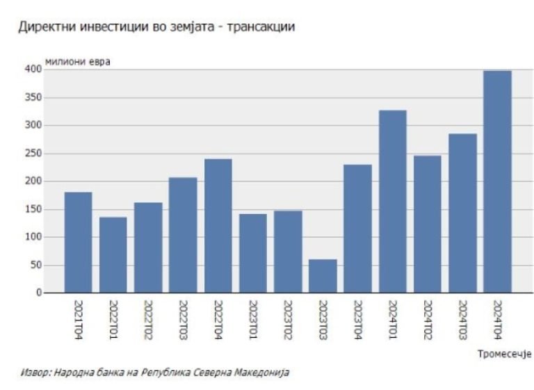 „Во текот на четвртиот квартал од 2024 година, вкупните директни инвестиции во земјата бележат нето-приливи од 397,5 милиони евра, како резултат на зголемените нето-приливи врз основа на меѓукомпанискиот долг (296,7 милиони евра) и зголемените инвестиции во сопственичкиот капитал (104,4 милиони евра), наспроти намалувањето кај реинвестирањето на добивката (3,6 милиони евра). Во 2024 година, вкупните директни инвестиции во земјата изнесуваат 1.255 милиони евра, како резултат на нето-приливите кај меѓукомпанискиот долг (за 686 милиони евра), сопственичкиот капитал (313,6 милиони евра) и реинвестираната добивка (255,3 милиони евра)“, се вели во извештајот на НБРМ.