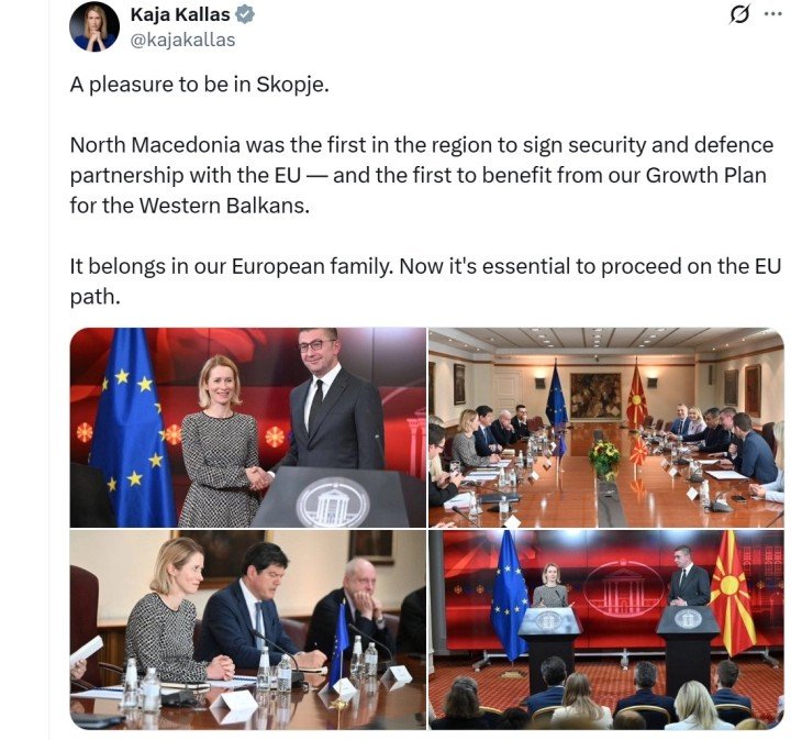 - Задоволство е да се биде во Скопје. Северна Македонија беше првата во регионот што потпиша партнерство за безбедност и одбрана со ЕУ – и првата што почна да ги користи придобивките од ншиот План за раст за Западен Балкан. Таа припаѓа во нашето европско семејство. Сега е неопходно да продолжи по патот кон ЕУ, напиша Калас на нејзиниот профил на платформата Икс.