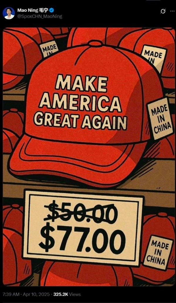 Портпаролката на кинеското Министерство за надворешни работи, Мао Нинг, објави илустрација на социјалните мрежи во која се потсмева на ефектите од царините на Трамп врз американските потрошувачи.