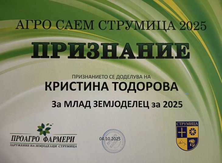 – Ова е уште еден поттик за мене, да продолжам напред со моите и нашите активности за одржливо земјоделство и производство на иновативни производи, во склоп на циркуларната економија. Оваа награда не е само моја, таа е заслуга и на мојот тим, моите поддржувачи и младите кои се дел од нашиот еко центар, истакна Тодорова, која има 27 години.