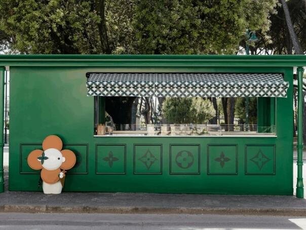 Препознатливите монограми на Луј Витон се истакнати, додека маскотата на брендот Вивиен е присутна во дизајнот, вклучувајќи го и просторот пред самиот киоск.