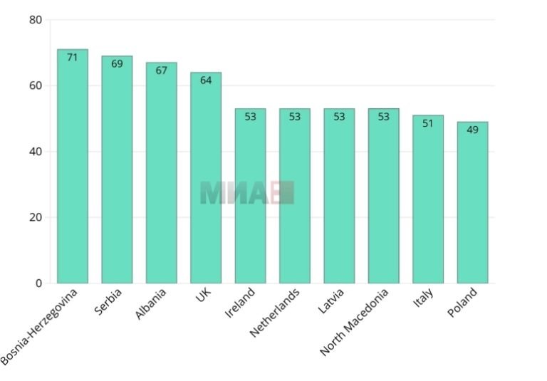 Македонската кибербезбедност е на незавидното 5. место, заедно со ирската, холандската и летонската – сите со рејтинг на ризик од 53 отсто. Следи италијанскиот систем безбедност (51 отсто), со околу 800 милиони пробивања. Полска е на 10. место со рејтинг на опасност од 49 отсто.