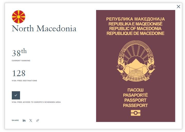 Имено, досега Македонија најдобар рејтинг имала во 2014 кога се наоѓала на 36 место според Henley Passport Index.