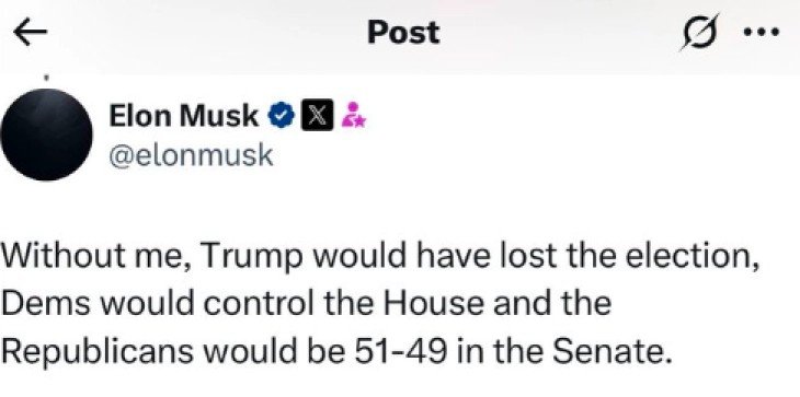„Без мене, Трамп ќе ги изгубеше изборите“, објави Маск на X.