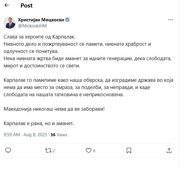 Карпалак е рана, но и аманет, напиша на својот профил на фејсбук, премиерот Христијан Мицкоски.