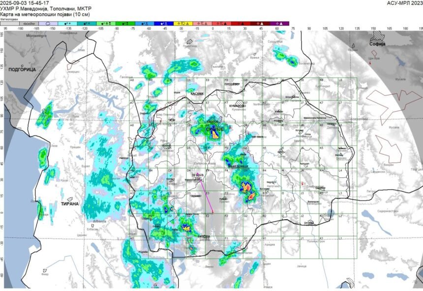 Нестабилната маса се движи од југ кон север. Поголема нестабилност западно од Кавадарци и Росоман проследена со пороен дожд засилен ветер и појава на суградица.