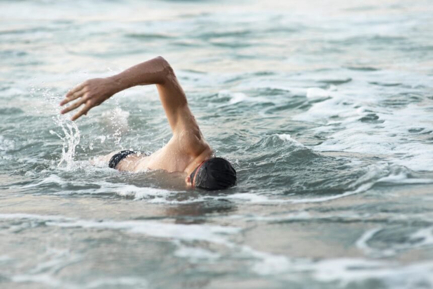 Во времето на прекинот на трката маратонците се бореа со брановите во близина на Гранит.