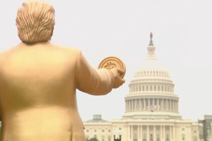Златна статуа висока 3,6 метри на претседателот Доналд Трамп која држи биткоин беше откриена вчера пред американскиот Капитол во Вашингтон.…