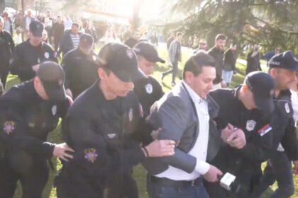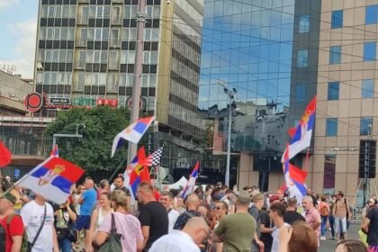 Пратениците меѓусебно се туркаа, удираа, фрлаа вода, а подигнат беше и транспарент на кој пишува „Србија се крева за да падне режимот“.