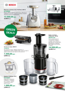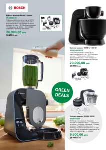 GREEN DEALS е промотивна акција на мали кујнски апарати BOSCH намалени и до 40%. Сите мали кујнски апарати имаат 2 годишна гаранција, а на одредени производи во тек е и десетгодишно бесплатно продолжување на гаранцијата за одредени компоненти.