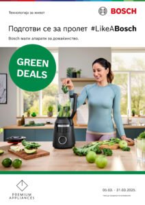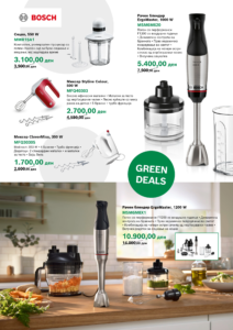 GREEN DEALS е промотивна акција на мали кујнски апарати BOSCH намалени и до 40%. Сите мали кујнски апарати имаат 2 годишна гаранција, а на одредени производи во тек е и десетгодишно бесплатно продолжување на гаранцијата за одредени компоненти.