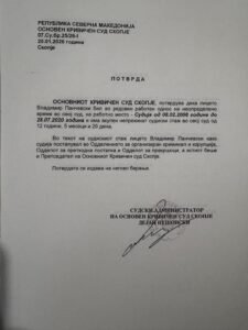 На потврдата е потпишан Дејан Нешовски како судски администратор на скопскиот Основен кривичен суд.