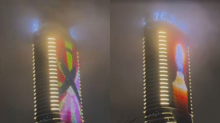 Пораката „За Кочани- Србија е со Македонија“ беше испишано синоќа на познатата „Палата Белград“ висока 168 метри во поддршка за трагедијата која се случи со пожарот во дискотеката „Пулс“.