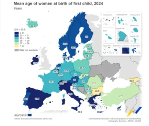 Просечната возраст на жените при раѓањето на нивното прво дете во ЕУ во 2024 година е 29,9 години, и се движи од 26,9 во Бугарија до 31,9 во Италија. Во Македонија жените првото дете во просек го раѓаат на 27,8 години.
