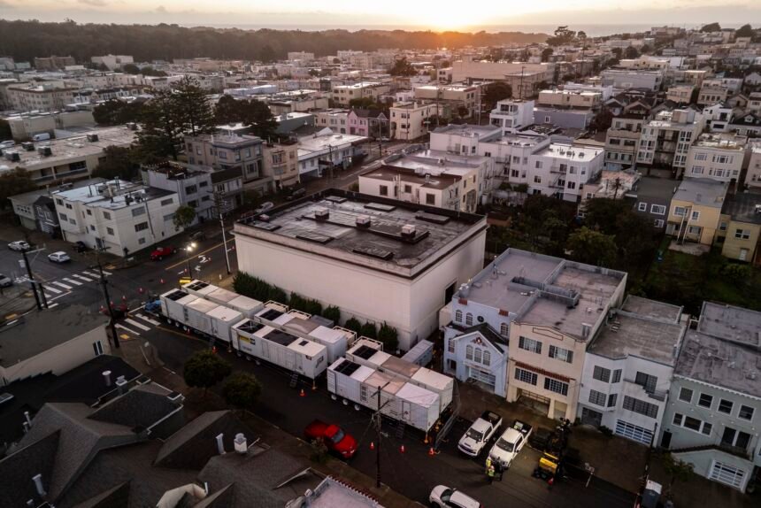 An aerial view of temporary generators is seen outside the Pacific Gas and Electric Co substation at 24th Avenue and Balboa Street in the Richmond neighborhood of San Francisco, Friday, Dec. 26, 2025. The generators were installed following the massive blackout on December 20th that left nearly a third of the city’s residents without power for hours.