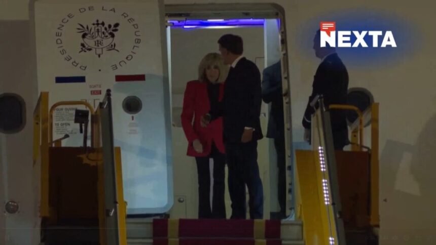 На следните снимки, Макрон и неговата сопруга – во црвена јакна – се појавуваат на врвот на скалите. Тој и ја пружа раката, но таа не прифаќа. Слегуваат по скалите заедно, рамо до рамо.