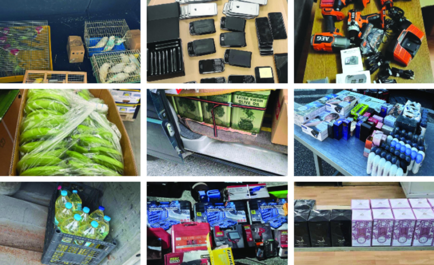 Царински службеници и мобилни царински тимови спречија обиди за шверц на 103 мобилни телефони, повеќе од два тони банани, 500 пакувања суплементи, 400 литри маслиново масло, 53 литри масло од црно семе, 24 килограми режан тутун, опрема за спа уреди, околу 400 парчиња козметика, над 100 парфеми од познати брендови, како и домашни птици.