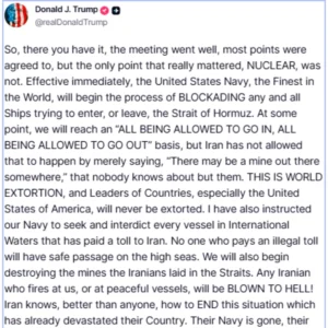 Американскиот претседател Доналд Трамп изјави дека Вашингтон „веднаш ќе почне да ги блокира бродовите што се обидуваат да влезат или излезат од Ормуската Теснина“.