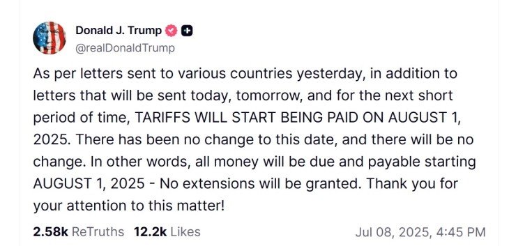 - Немаше промени до овој датум, ниту пак ќе има промени. Со други зборови, сите пари ќе доспеат за плаќање почнувајќи од 1 август 2025 година, напиша тој на Truth Social.