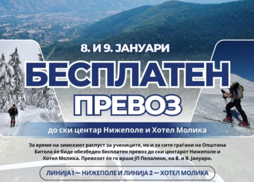 Од Општина Битола информираат дека локалната самоуправа и јавното претпријатие „Пелалинк“ и оваa зима за време на зимскиот распуст за учениците, но и за сите граѓани, обезбедиле бесплатен превоз до ски центрите на Нижо Поле и „Молика“.