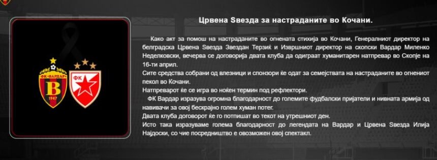– Како акт за помош на настраданите во огнената стихија во Кочани, Генералниот директор на белградска Црвена Ѕвезда, Звездан Терзиќ и Извршниот директор на скопски Вардар, Миленко Неделковски, вечерва се договорија двата клуба да одиграат хуманитарен натпревар во Скопје на 16-ти април.