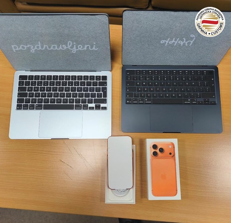 Во друг случај царинските службеници од Меѓународен Аеродром Скопје при контрола на багаж на патник, македонски државјанин, кој допатувал со лет од Лондон пронајдоа два лаптопи и еден мобилен телефон од брендот „Ејпл“.