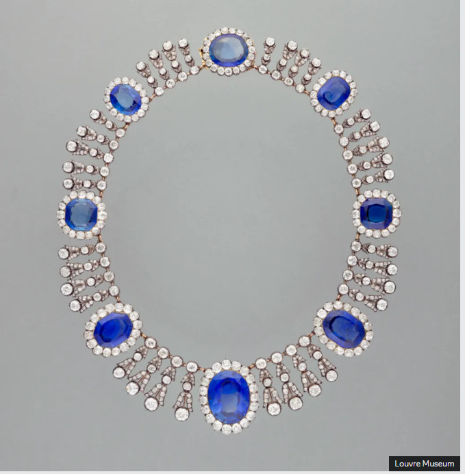 Од колекцијата на кралиците Мари-Амели и Хортенза: тиара, ѓердан и пар обетки од сет со сафири.