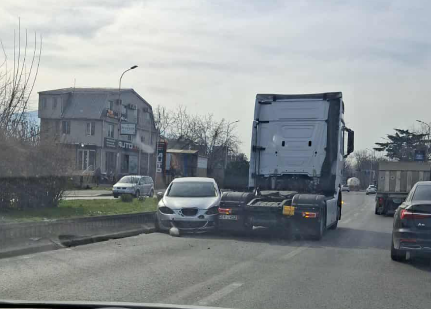 Според фотографиите на социјалните мрежи, автомобилот е свртен во спротивен правец и заглавен меѓу жардиниера и камион.
