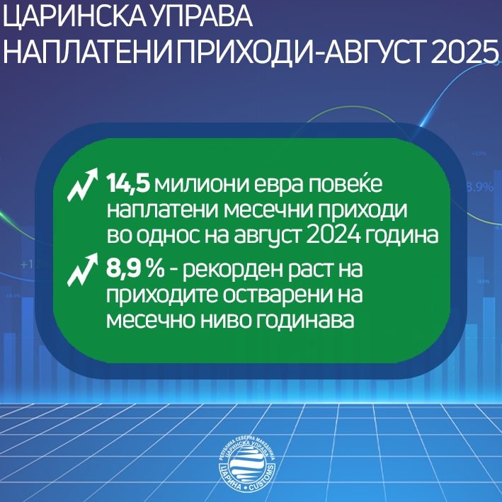 За 14,5 милиони евра е зголемена наплатата на приходи во август во царината во споредба со истиот месец минатата година, што претставува рекорден раст на приходите од 8,9 проценти остварени на месечно ниво годинава, соопшти Царинската управа.