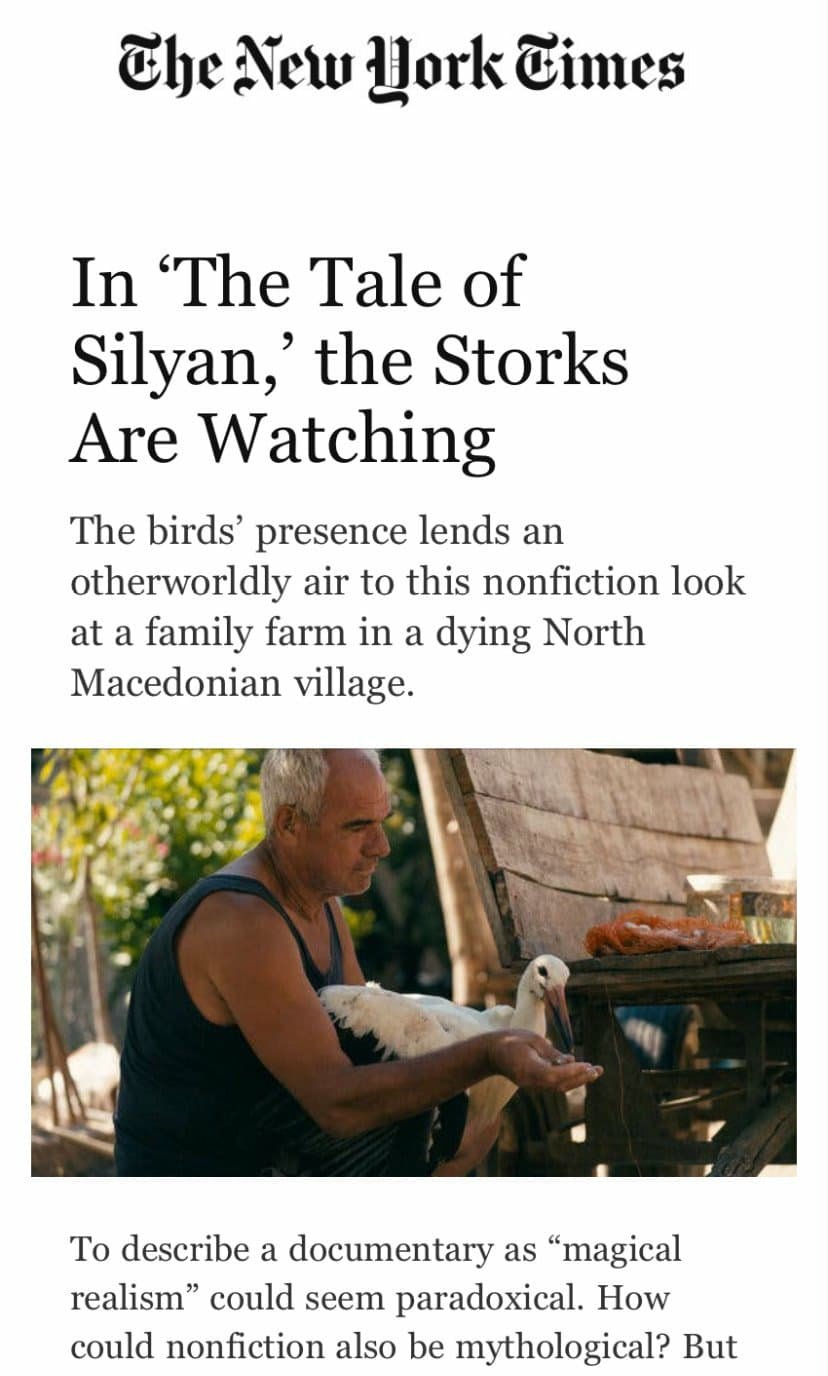 „Филмот на Котевска од 2019 година, „Медена земја“, првиот што доби номинации за Оскар и во меѓународната и во документарната категорија, исто така, ги разгледа начините на кои промените во животната средина, традиционалното земјоделство и миграцијата беа испреплетени во рурална Македонија. Тој филм имаше сонувачки квалитет што се пренесува и на „Приказната за Силјан“, но овој има чудна дивост, благодарение на присуството на штрковите. Тие изгледаат како уште еден збир жители во селото, особено затоа што човечката популација се чини дека постојано се намалува. Штрковите постојано гледаат, како духови, со нивните издолжени пропорции и вратови што можат целосно да се свиткаат наназад.“, пишува Вилкинсон.
