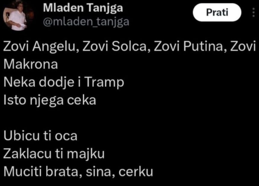 Опозиционерот Младен Тањга објави стихови во кои директно му се заканува на семејството на претседателот Александар Вучиќ.